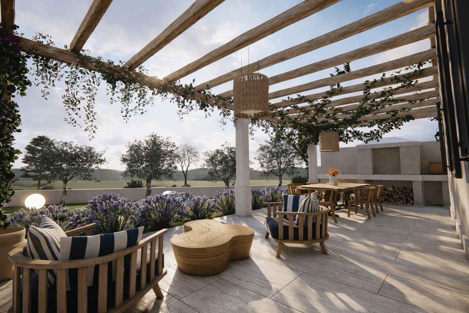 Life extends outward under a long pergola structure that runs along the main facade, forming a shaded outdoor room for dining and relaxation. Sun terraces, built-in seating and a fire pit are subtly arranged to support different uses without disrupting the overall clarity of the space.
