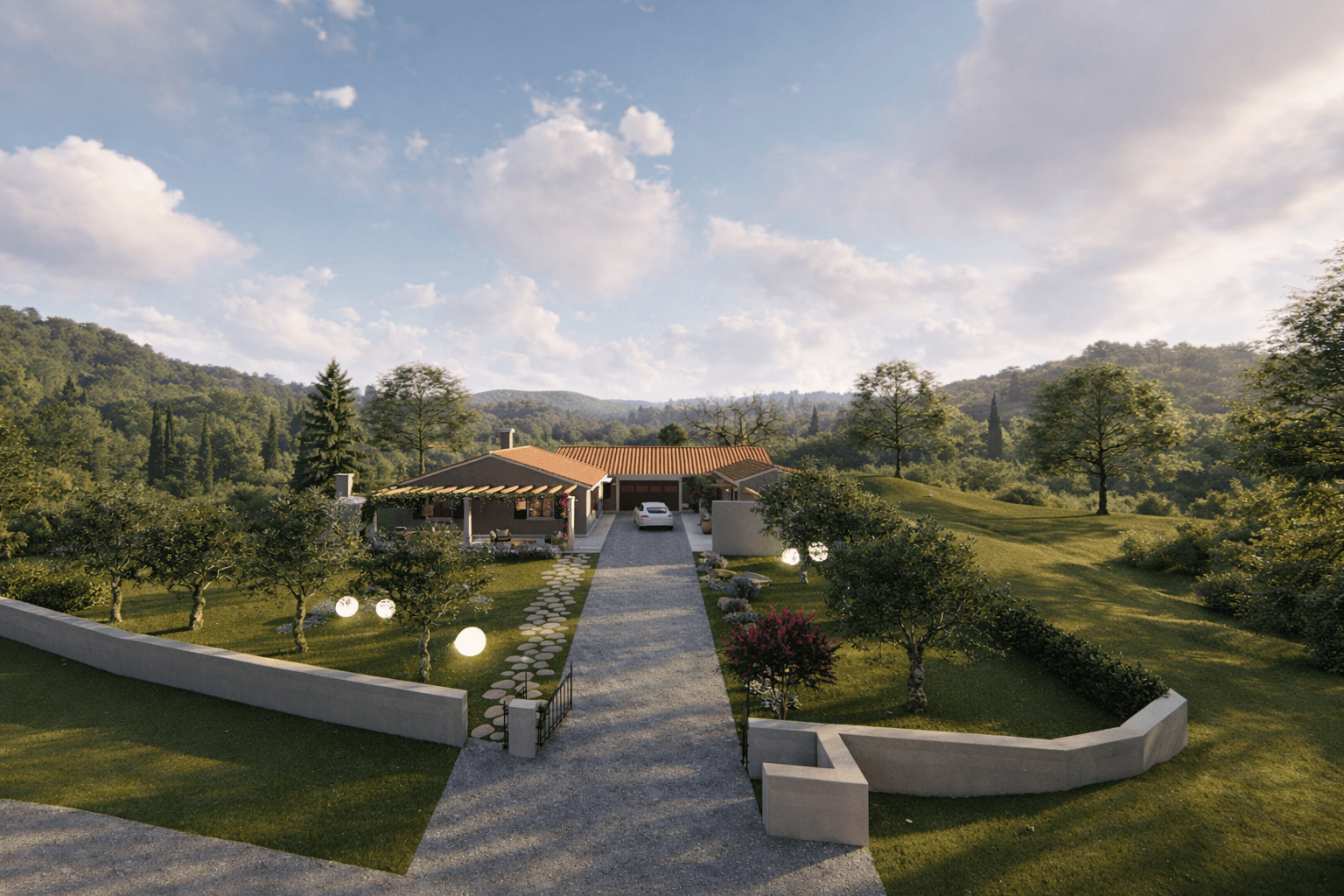 The surrounding garden is deliberately composed, combining olive trees, lavender and low Mediterranean planting with gravel paths, natural stone and softly defined lawn areas. Discreet spherical and ground lighting accentuates textures and circulation after sunset, allowing the house and garden to remain legible and atmospheric at night.